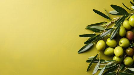 Greek organic olives and olive branch and leaves isolated on a yellow green background with space for text