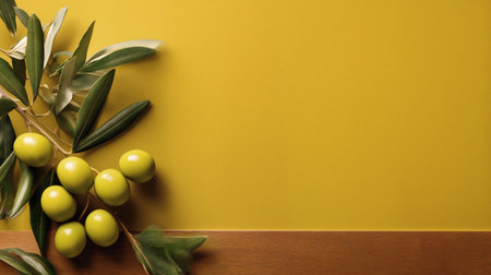 Fresh green olives resting on a leafy olive branch with a vivid yellow and wood-toned backdrop perfect for highlighting organic produce, healthy eating, and Mediterranean flavours