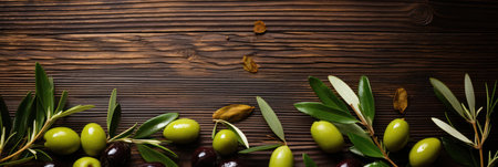 Olive branch on wooden rustic background . Fresh and Healthy organic olive fruits border design with copy space for your text