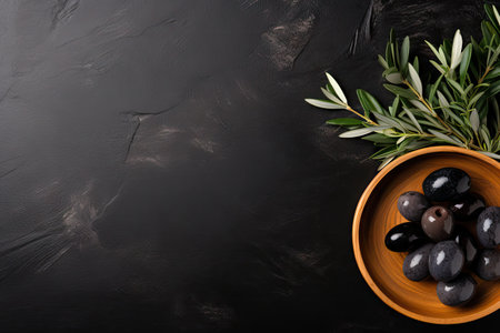 natural olives on black stone background with olive branches and space