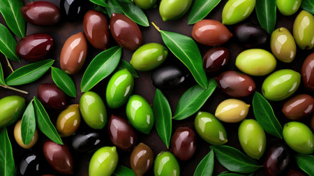 Green and black olives with leaves texture background, italian harvest
