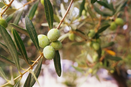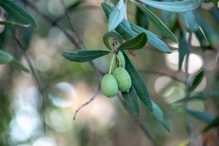 Olives on a branch of an olive tree. Detail close-up of green fruit olives with selective focus and shallow depth of field.