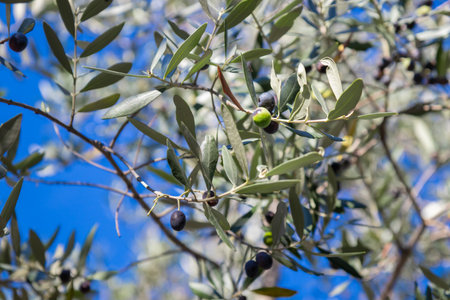 Olives on the branches in the garden. Sunlight through the leaves. Sunny Italian gardens. Selective focus in the frame. Against the background of blue sky. branches are out of focus. Copy space.