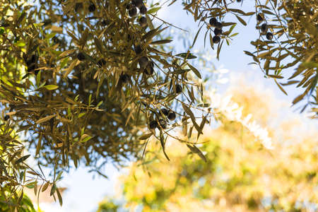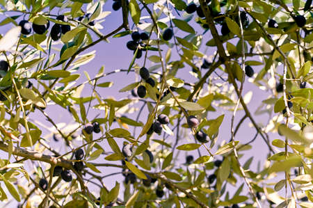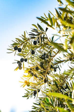 Landscape Harvest ready extra virgin olive oil. Black Olives hanging from a tree with sun glare. close-up.