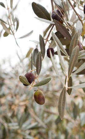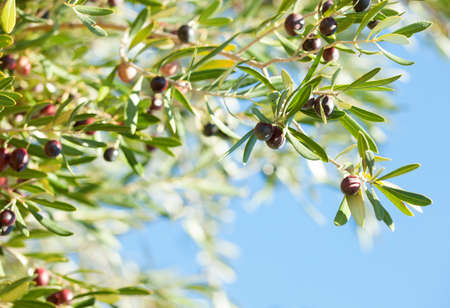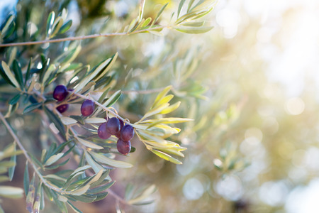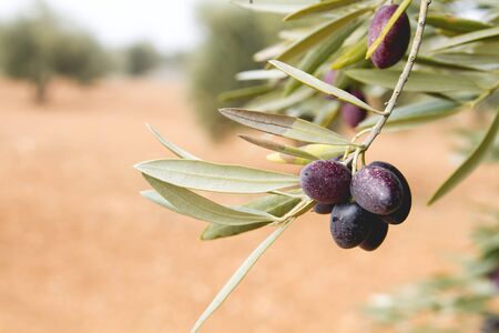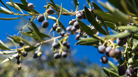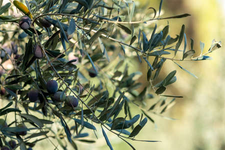 Spanish olive grove, branch detail. Raw ripe fresh olives growing in mediterranean garden ready to harvest, soft focus.