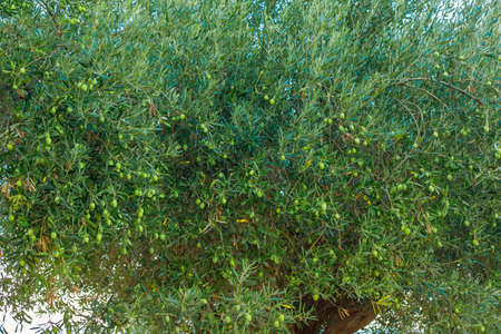 Green tree, bush with growing, ripening dark olives. Mediterranean plants, food concept.