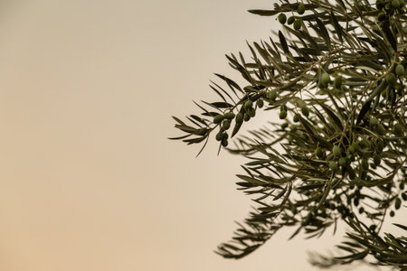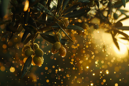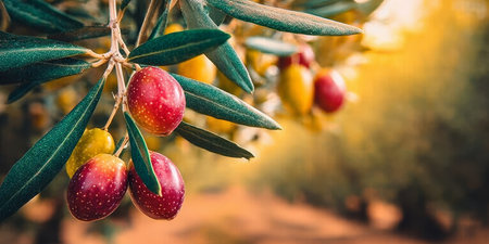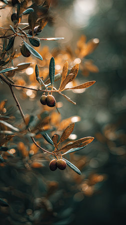 Closeup of Sunlit Olive Branch with Ripening Olives, Showcasing Nature s Bounty and Rural Beauty