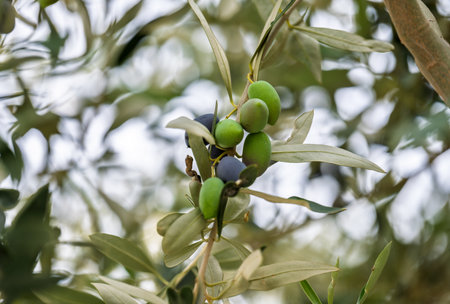 Olives growing on olive tree grove, close up macro view, branch of ripe dark and green olives fruits in a summer sunny day, Ionian sea islands, Corfu, Greece