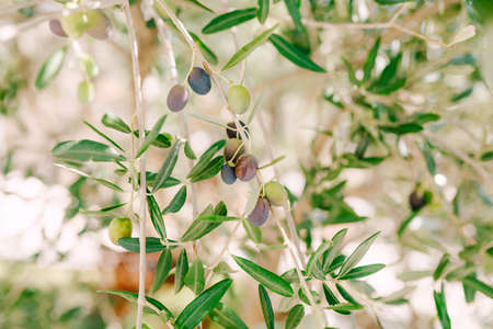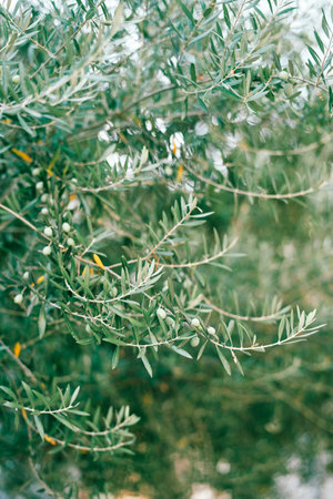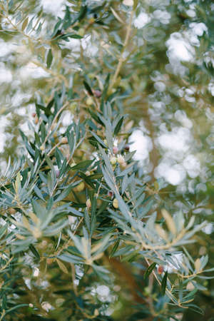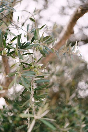 Olive branch with fruits. Olive groves and gardens in Montenegro.