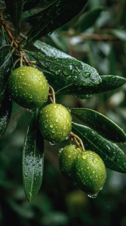 Olive in gentle light rain, soft raindrops visible on vivid green leaves, natural realistic style, bright fresh colors, balanced wide composition, cinematic framing, highly detailed.