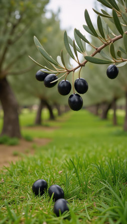 Juicy olives dangle from branches of a healthy olive tree in a serene grove on a sunny afternoon.