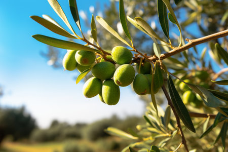 Olive branch adorned with ripe olives set against a bright blue sky, highlighting lush green foliage and the essence of nature's bounty, AI generated