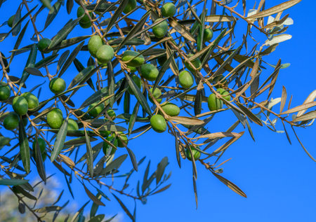 Closeup of a olive branch with leaves and green olives. Olive tree close up in Greece, Corfu, clear sky background.