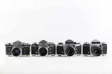 The four old German 35 mm SLR film camera Exakta released 1951 - 1967, with Carl Zeiss lens 50 mm on a white background. The real Ihagee Factory Products Exakta.