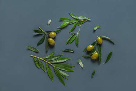 Green olives and leaves on dark background
