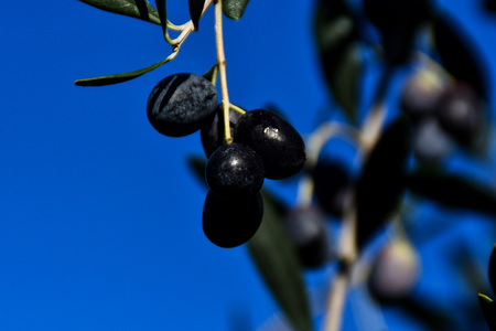 Olives on the branches in the garden. Sunlight through the leaves. Sunny Italian gardens. Selective focus in the frame. Against the background of blue sky. branches are out of focus. Copy space.