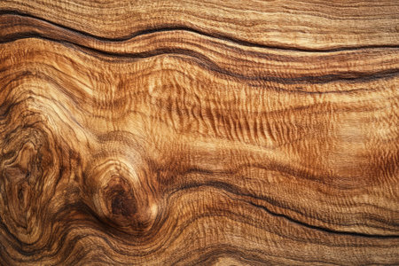 Detailed close-up of swirling wood grain in rich brown and tan hues with prominent dark knots.