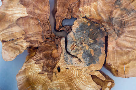 Tree cut slice section, uneven shape, natural texture, soft colored brown and yellow stump natural vintage cracked old colorful background. Do It Yourself art concept.