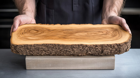 A stunning rustic wood plank is held with care against a sleek gray surface, showcasing natural textures and craftsmanship for artistic inspiration. Perfect for creative projects.