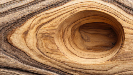 This image presents a detailed view of a wooden surface, showcasing the natural grain and patterns of the material. The composition features an oval-shaped indentation at the center, surrounded by swirling lines and textures. The warm tones and lighting suggest a studio or well-lit environment, ideal for various commercial and design projects.