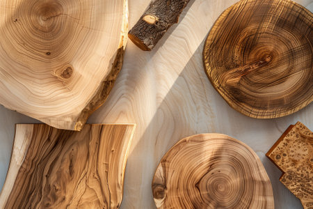 Woodworking wood slices that showcases stunning natural patterns along with captivating shadow play. Generative AI