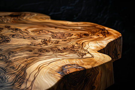 Slab and brown countertop, saw cut wood treated varnish close-up on a black background. Isolate. Luxury wood for countertops and tables. Design materials, details for presentation and shop. Concept.