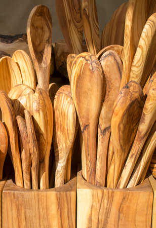 Kitchen utensils on outdoors Easter festival or weekend agricultural fair. Plates, bowls, bread boxes and cutting boards make of olive wood.