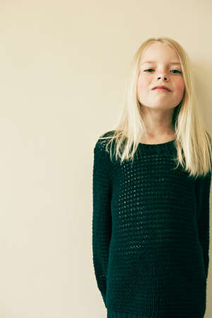 Pretty little girl blue eyes and long blonde hair wears white shirt isolated beige background. Caucasian beautiful fashion child model. Natural lighting