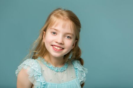 Potrait of nice smiling little girl with logng hair posing over blue background in studio. Isolated.