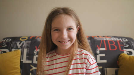 Portrait of happy blonde girl looking into camera and laughing indoor. Joyful female child sitting on the sofa at room. Close up emotions of smiling kid with glad expression on her face. Slow motion