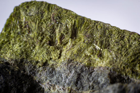 Vibrant Green Epidote Mineral on Matrix Against Light Background