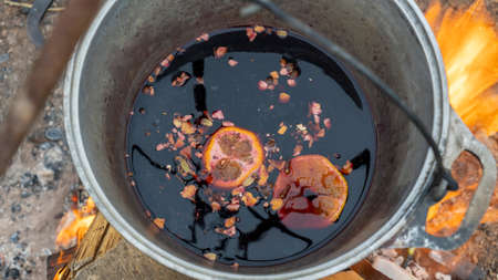 Mulled wine in a tourist pot over hot camp fire. Mulled wine by the fire. Mulled wine cooked on fire outdoors. picnic. Romantic getaway near the fire.