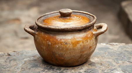 AI Generated. Rustic Brown Clay Pot of Flavorful Curry with Green Herb Garnish