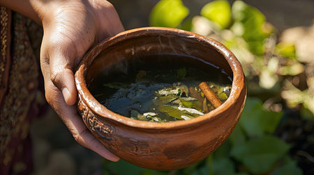 A close-up of a hand holding a rustic clay bowl filled with steaming herbal tea. Fresh leaves and spices infuse the drink with earthy aromas and health benefits.