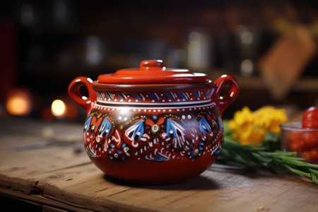 A red pot sitting on top of a wooden table. This versatile image can be used for cooking, kitchenware, or home decor themes.