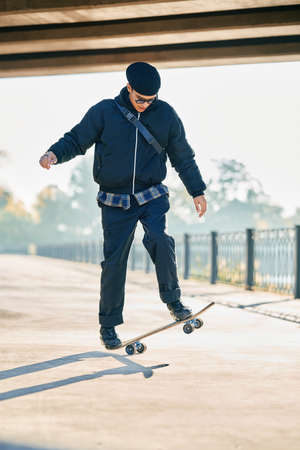 Skateboarder doing a trick at the city's street in sunny day. Young man in sneakers and cap riding and longboarding on the asphalt.