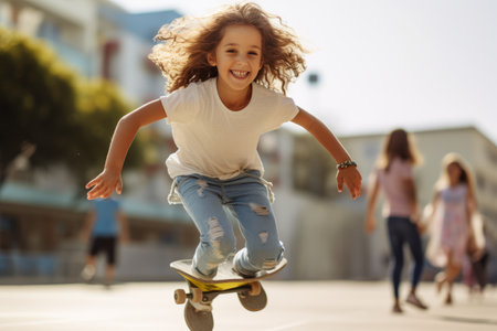 Happy little girl riding a skateboard on the street with friends in the background