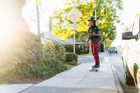 Skateboarder doing a trick at the city's street in summer's sunshine. Young man in sneakers and cap riding and skateboarding on the asphalt. Concept of leisure activity, sport, extreme, hobby and motion.