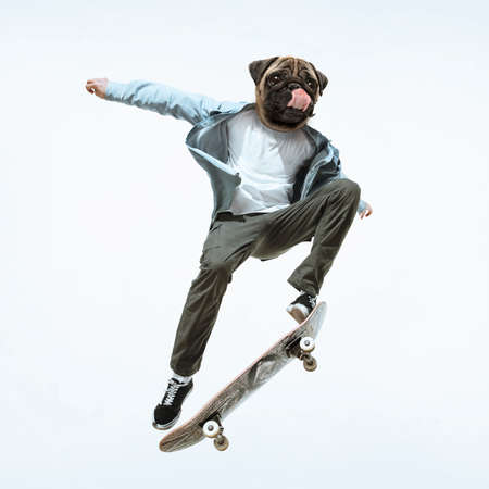 Caucasian young skateboarder riding isolated on a white studio background. Man in casual clothing training, jumping, practicing in motion. Concept of hobby, healthy lifestyle, youth, action, movement.