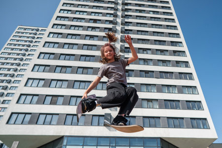 Skater girl jumping with skateboard against blue sky with clouds, performing a trick in urban environment
