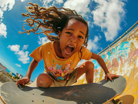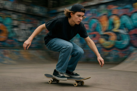 Teenager skateboarding in a vibrant skate park, executing impressive tricks while fully immersed in the energetic urban lifestyle