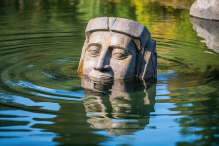 a stone sphinx statue peeking above water surface, created with generative ai
