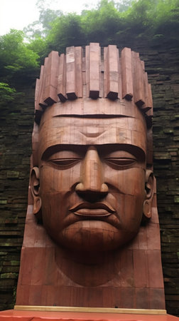 A statue of a large stone head with beard and mustache, AI