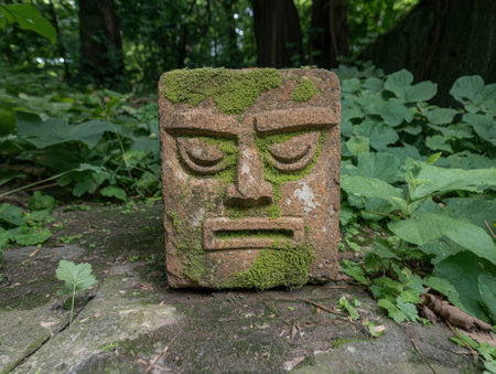 a face sits on a moss-covered sculpture, resembling organic stone carvings. this uhd image showcases the influence of native american, first nations, and alaska native art, with a touch of psychedelic surrealism. the shallow depth of field adds to the serene mood of this captivating photo. ai generated