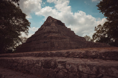 A majestic pyramid stands tall, a testament to the ancient Mayan civilization. Its intricate structure and weathered stone whisper tales of a bygone era.