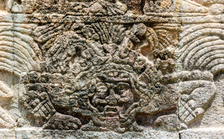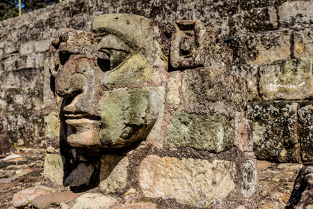 Copan Ruins, Honduras. February 2018. A view of some of the head carvings at the UNESCO world heritage site at Copan Ruins in Honduras.