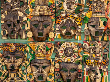 Colored wooden masks at a souvenir stand in Chichen Itza, Yucatan, Mexico