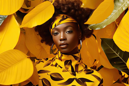 a woman with afro hairs and yellow leaves on her head in the background is an image of a black woman