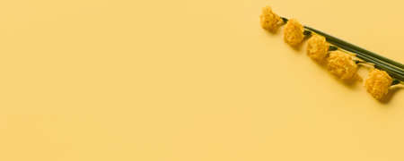 Yellow tender flowers on yellow background, flyer. Greeting card to Mother's, Parent's day. Beautiful mock up with copyspace. Celebrating, spring and summer mood, family concept. Feminine look.