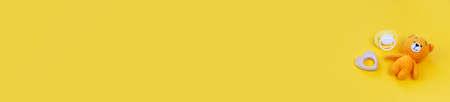 baby bear and pacifier on a yellow background. Selective focus. kid.